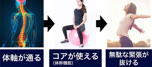 体軸を整え体軸が意識できると、このコアマッスルをうまく使えるようになることで、体の土台部分である体幹が安定します。土台部分が安定すると、手足や背中の無駄な緊張が抜けるため、動きがスムーズになったり、負担が減ったりするなどの動きの変化が見られるのです。