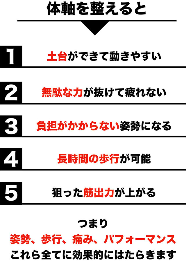 単純に、筋肉をつけてもダメ、筋膜を緩めるだけでもダメ、関節可動域が広げるだけでもダメ、運動療法を繰り返してもダメ、、、普通にリハビリやトレーニングをしたり整体を行っても体軸が整うことはありません。